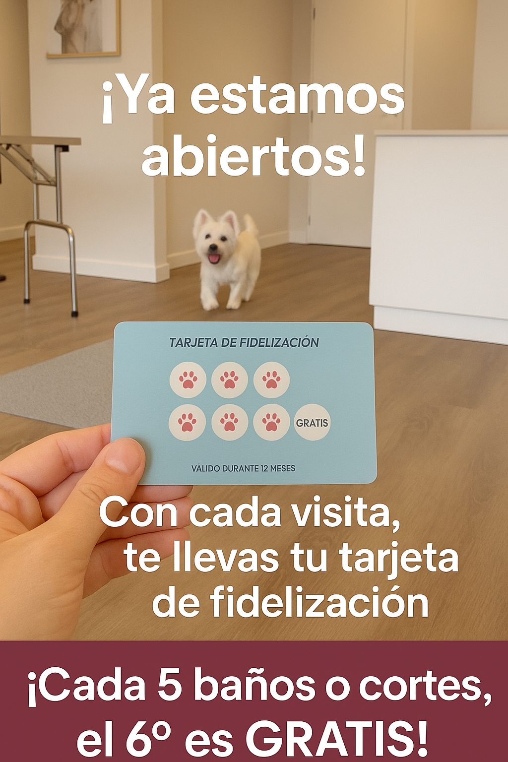 Con cada baño o corte, acumulas una huella en tu tarjeta. ¡Al llegar a 5, el siguiente es totalmente GRATIS! Válido durante 12 meses.